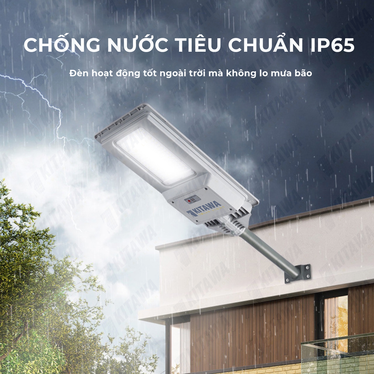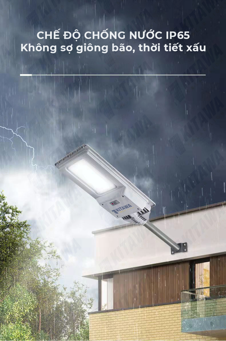 Đèn Năng Lượng Mặt Trời Liền Thể 200W KITAWA được trang bị chuẩn IP65 có khả năng chống bụi và chống nước vượt trội để bạn yên tâm lắp đặt ngoài trời và sử dụng trong mọi điều kiện thời tiết