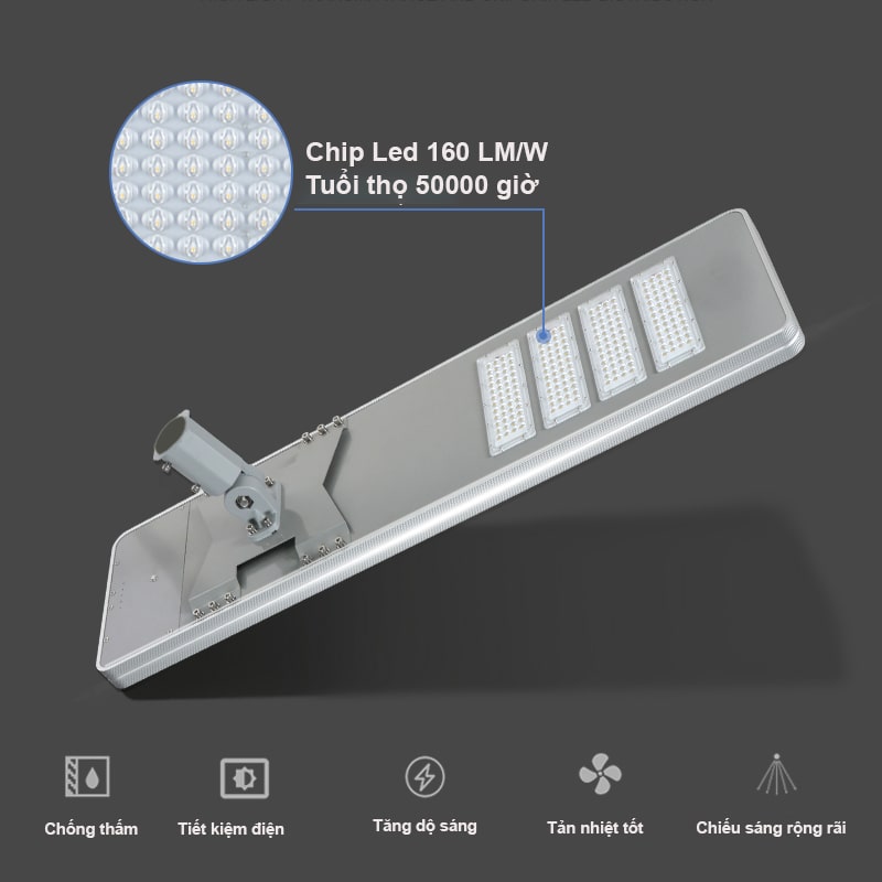Đèn cũng được trang bị Chip Led chất lượng, có hiệu suất cao. Chip LED có tuổi thọ cao và giữ được mức độ đều màu cao hơn. Tuổi thọ LED là hơn 50.000 giờ (tương đương 12 năm sử dụng). Ngoài ra đèn thiết kế mỗi chíp Led sẽ có một thấu kính khuếch đại gắng kèm, thấu kính có hình dạng cánh dơi giúp phân bố ánh sáng được đồng đều hơn.