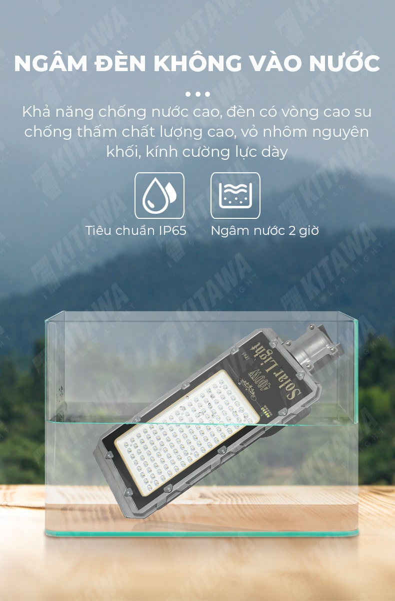 Đèn pha năng lượng mặt trời 400W KITAWA BC6400 có khả năng chống bụi tuyệt đối, vượt qua bài test ngâm dưới nước vẫn có thể hoạt động, chiếu sáng bình thường. Và không bị ảnh hưởng bởi vòi phun áp lực từ mọi hướng. Khả năng kháng nước và kháng bụi đã được thực hiện trong môi trường test nghiêm ngặc và thực tế sử dụng được phản hồi từ Quý khách hàng. Do đó bạn có thể lắp đặt đèn ở bất kì vị trí nào ngay cả ngoài trời mà không cần lo lắng nhiều về vấn đề nắng mưa, gió bão.
