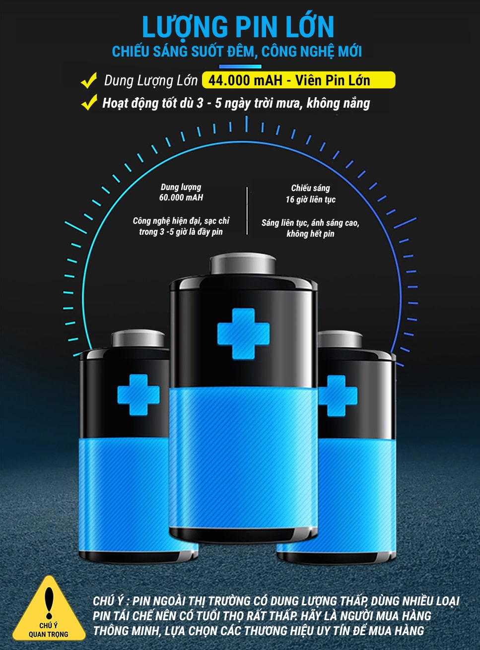 - Một phần rất quan trọng đáng để quan tâm đến khi lựa chọn đèn năng lượng mặt trời là PIN, đèn sử dụng lâu hay không phụ thuộc rất nhiều vào dung lượng mà tuổi thọ PIN.