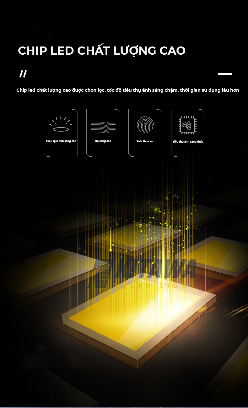 Đèn cũng được trang bị Chip Led chất lượng. Với 800 chip giúp tuổi thọ cao hơn so với các loại Led thông thường khác và giữ được mức độ đều màu cao hơn. Tuổi thọ LED là hơn 50.000 giờ (tương đương 12 năm sử dụng). Ngoài ra đèn thiết kế mỗi chíp Led sẽ có một thấu kính khuếch đại gắng kèm giúp phân bố ánh sáng được đồng đều hơn.