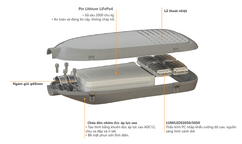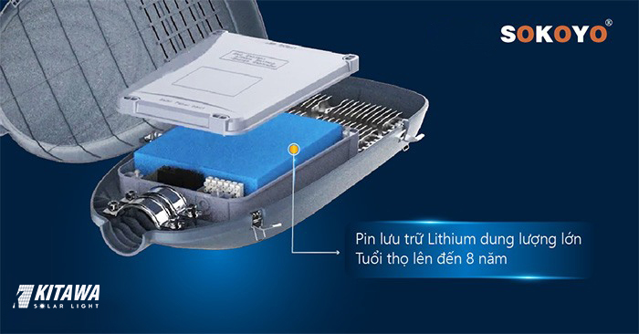 Đèn sử dụng pin Lithium sắt photphat - LiFePO4. Đây là loại pin có hiệu quả nạp/xả tốt nhất được ứng dụng trên đèn năng lượng mặt trời hiện nay.