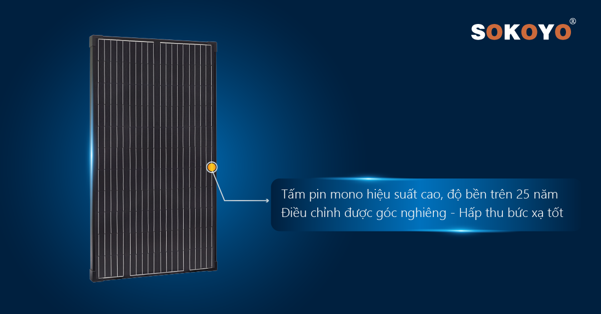 -Tấm năng lượng Mono được trang bị trên đèn năng lượng mặt trời Sokoyo Capsol có tuổi thọ > 25 năm.