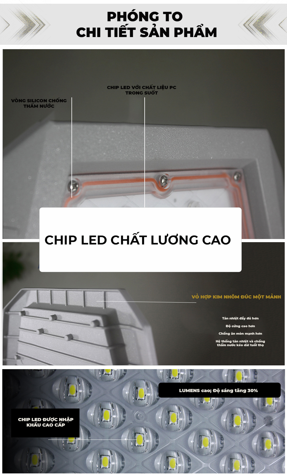 Đèn cũng được trang bị Chip Led chất lượng. Với chip LED CMD2835 300 giúp tuổi thọ cao hơn so với các loại Led thông thường khác và giữ được mức độ đều màu cao hơn. Tuổi thọ LED là hơn 50.000 giờ (tương đương 12 năm sử dụng). Ngoài ra đèn thiết kế mỗi chíp Led sẽ có một thấu kính khuếch đại gắng kèm giúp phân bố ánh sáng được đồng đều hơn.