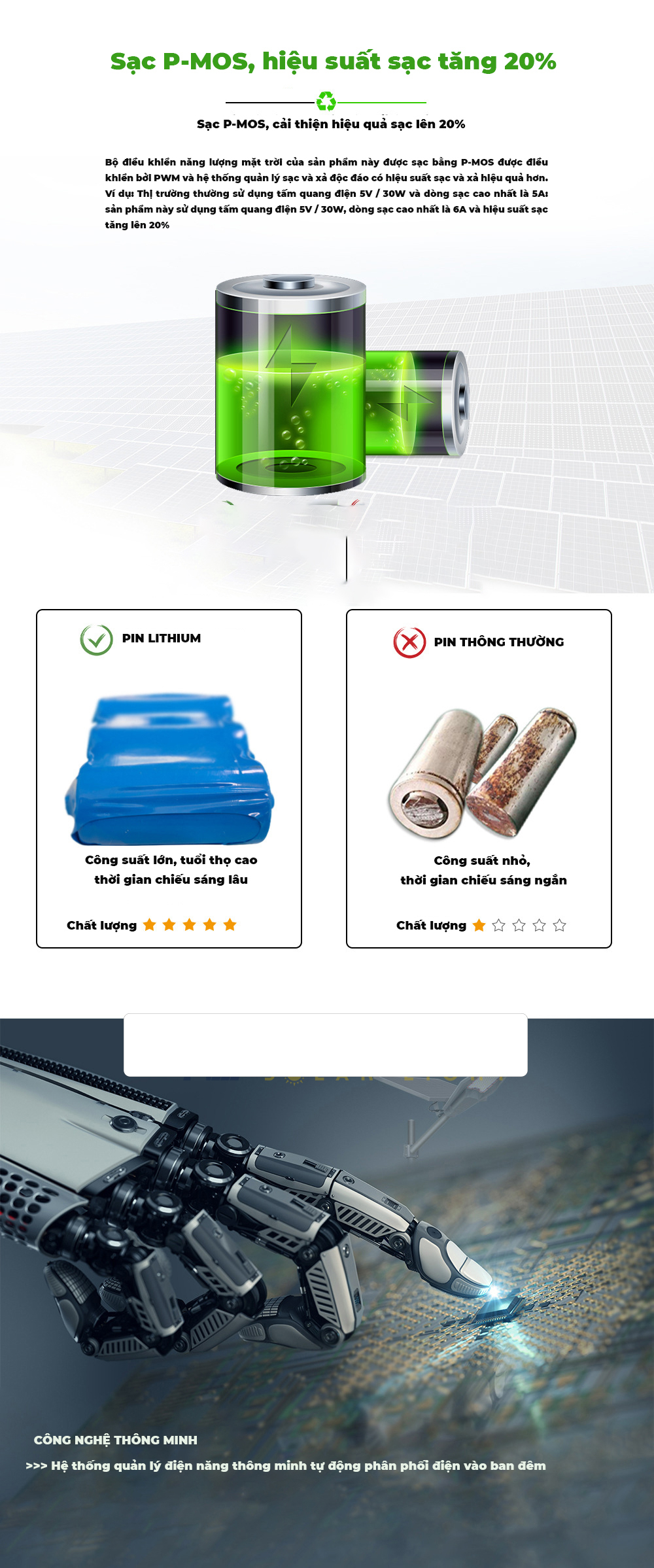 - Một phần rất quan trọng đáng để quan tâm đến khi lựa chọn đèn năng lượng mặt trời là PIN, đèn sử dụng lâu hay không phụ thuộc rất nhiều vào dung lượng mà tuổi thọ PIN.