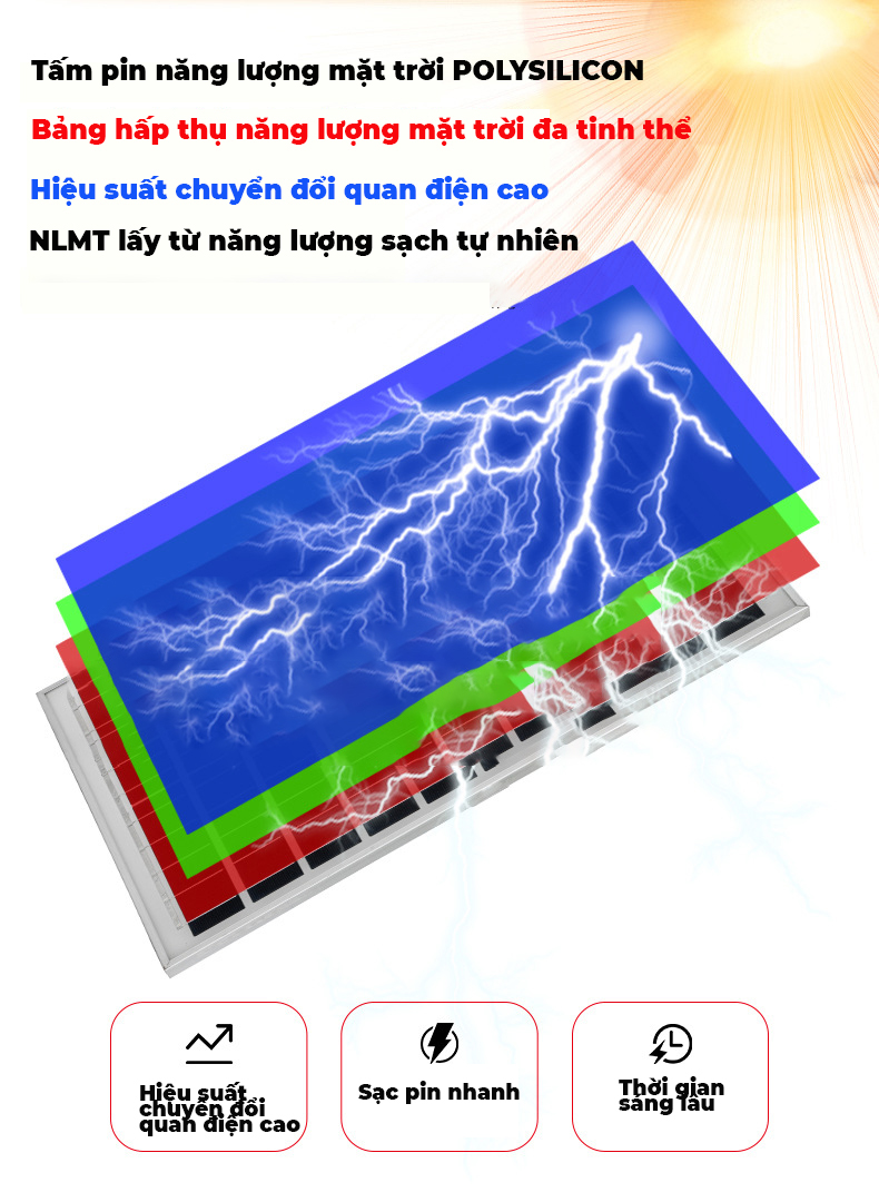 Tấm pin đa tinh thể Polysilicon giúp đèn sạc nhanh chóng. Pin có thể được sạc đầy chỉ từ 4-6 giờ nắng tiêu chuẩn.