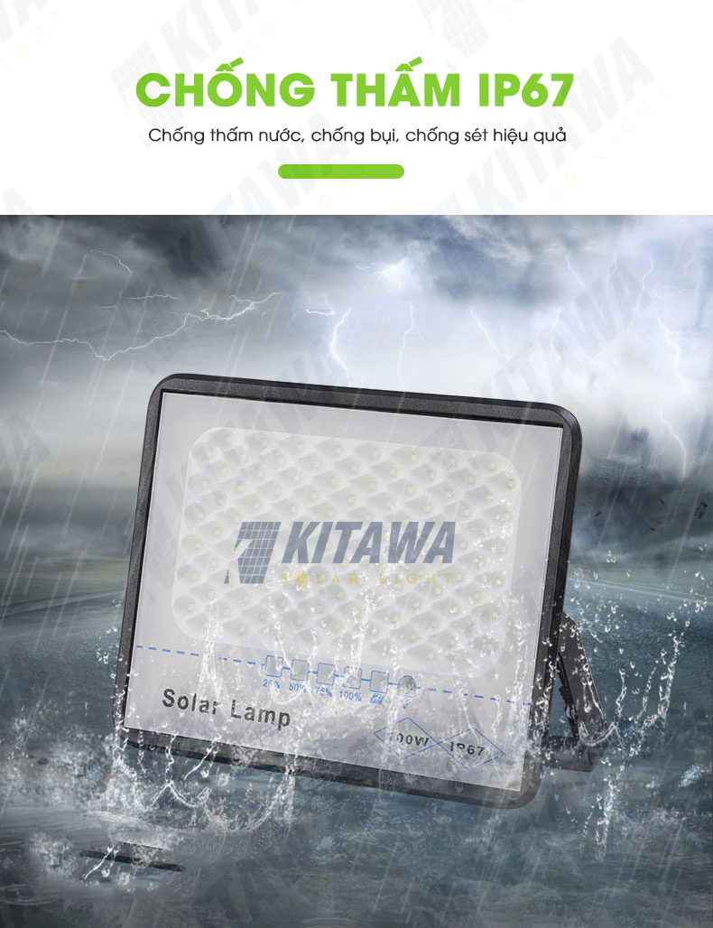 Đèn Pha Năng Lượng Mặt Trời Chống Chói 100W KITAWA được trang bị chuẩn IP67 có khả năng chống bụi và chống nước vượt trội để bạn yên tâm lắp đặt ngoài trời và sử dụng trong mọi điều kiện thời tiết
