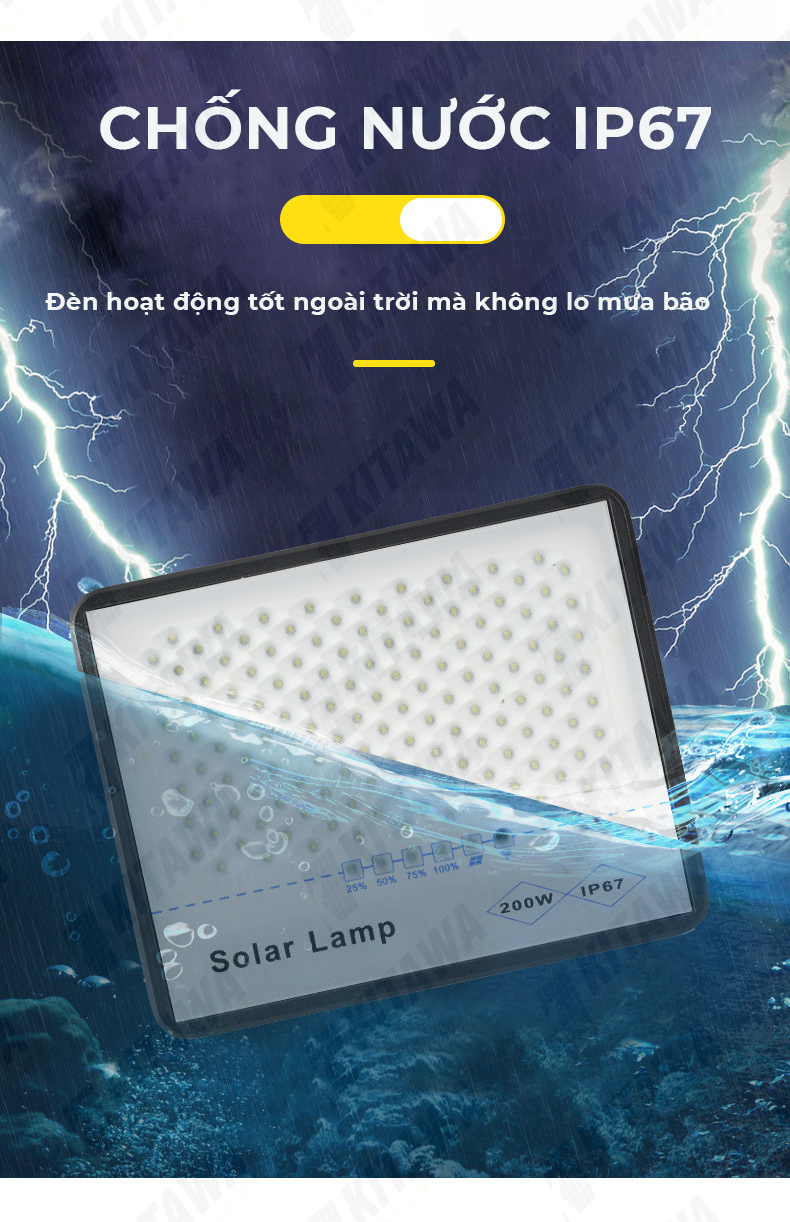 Đèn Pha Năng Lượng Mặt Trời Chống Chói 200W KITAWA được trang bị chuẩn IP67 có khả năng chống bụi và chống nước vượt trội để bạn yên tâm lắp đặt ngoài trời và sử dụng trong mọi điều kiện thời tiết